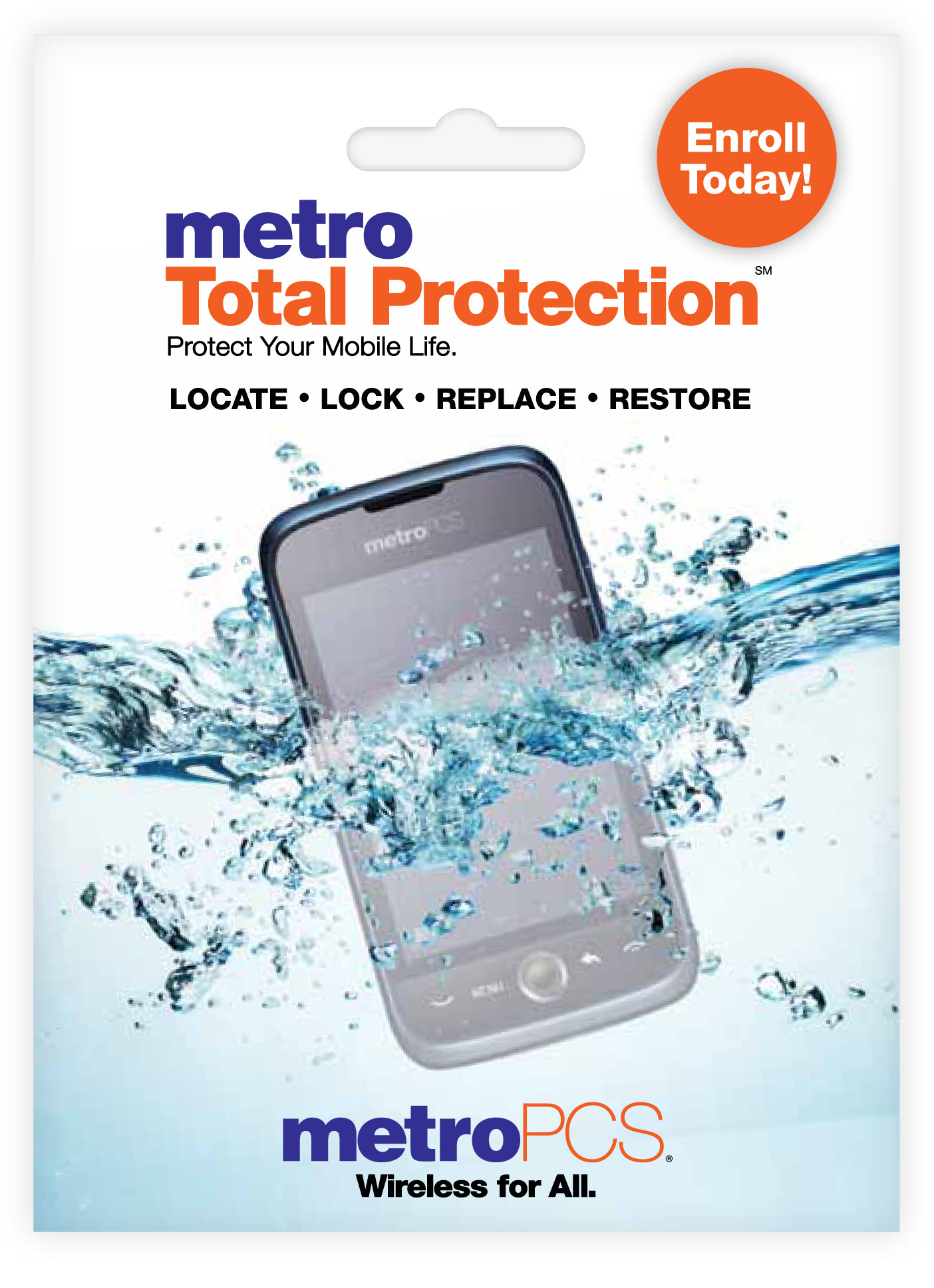A customer-facing Device Protection brochure to hang in the Metro retail stores. While the product is device protection, the brochure serves as something tangible customers can touch and use. There is a pocket for a Terms and Conditions booklet insert and wallet card tear-off for the customer to keep.